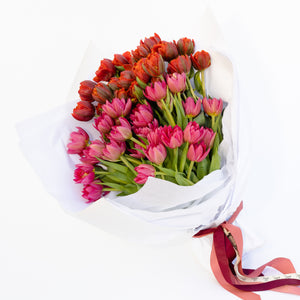 Please note: All imagery is a reflection and flowers do vary in colour, type and size. Our bouquets are unique and no two bouquets will be the same. Flowers, wraps, ribbons and foliage will vary between each order, due to seasonal availability. The ribbons & wrap will be selected by our florist to complement the bouquet. All blooms arrive with care instructions.